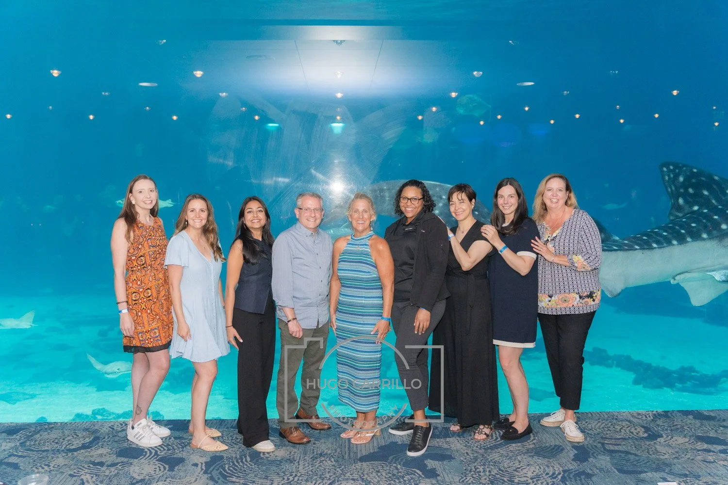 Group of nine people standing in front of an aquarium with a whale shark in the background.