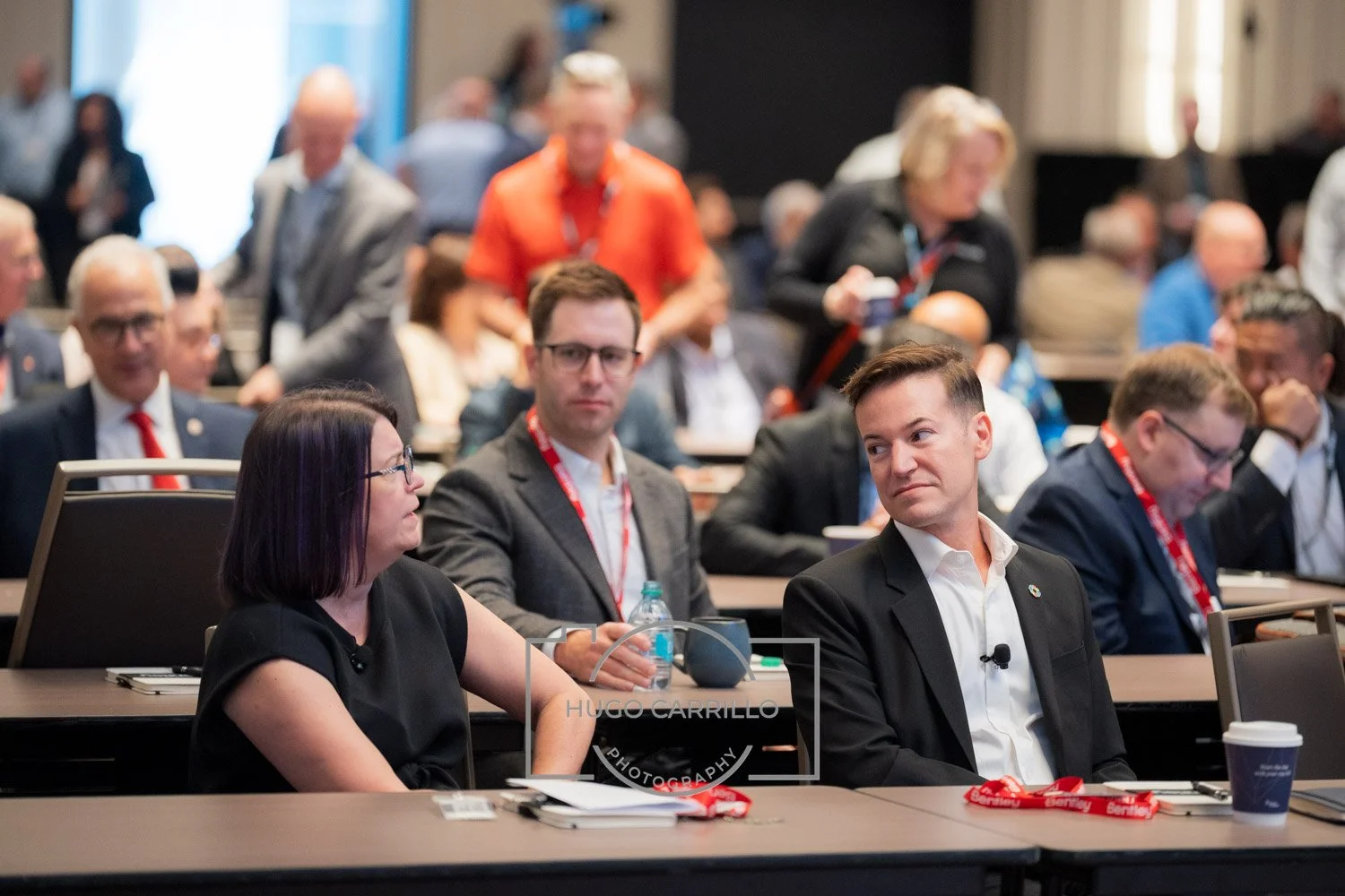 Attendees participate in a conference or seminar, sitting at tables with notebooks, water bottles, and conference badges, in a crowded conference hall.
