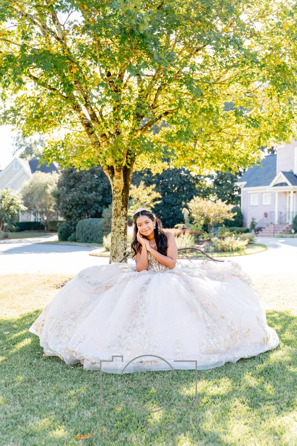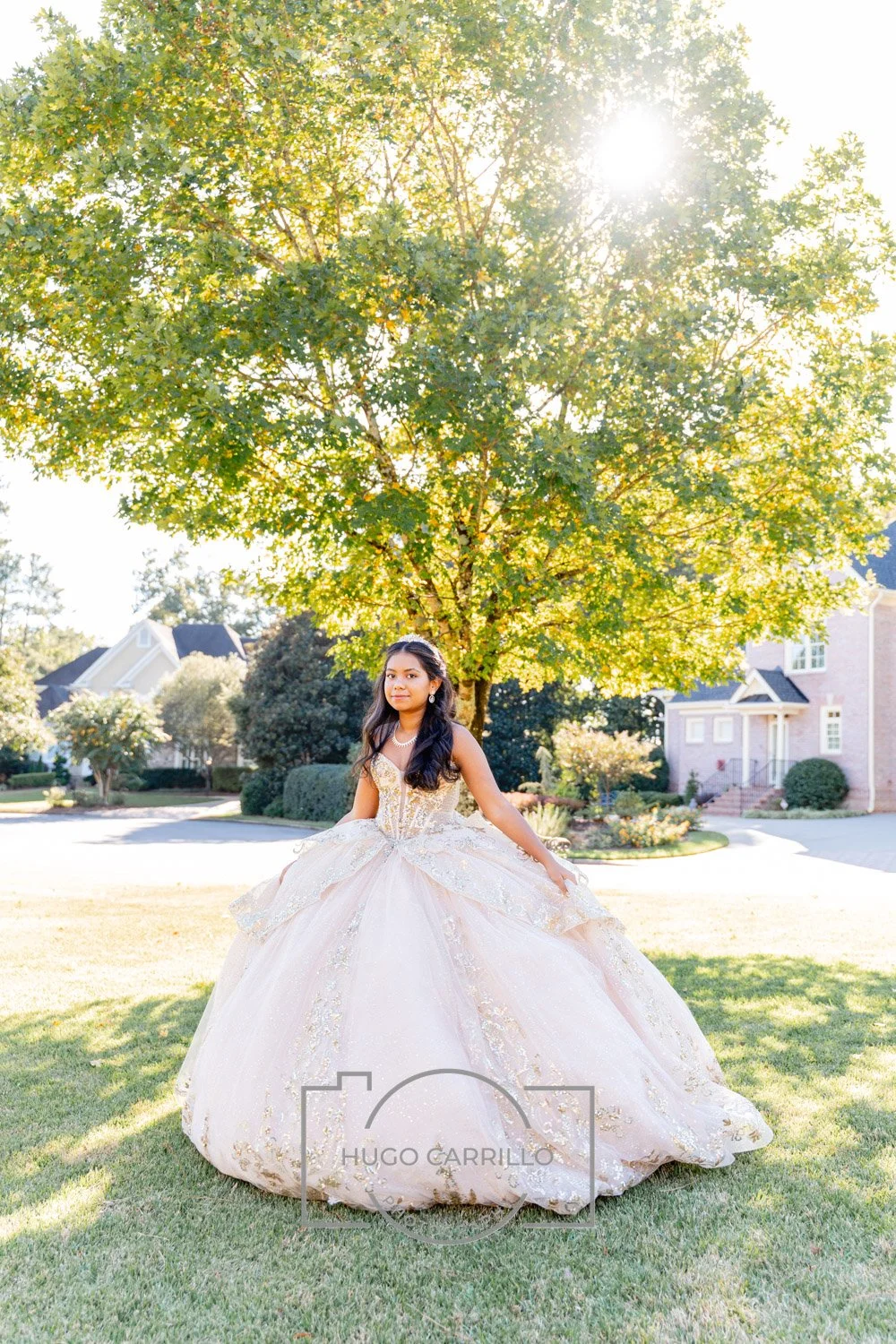 quinceañera in an elaborate cream-colored ball gown standing on grass in front of a large tree with sunlight shining through its leaves in a suburban neighborhood.