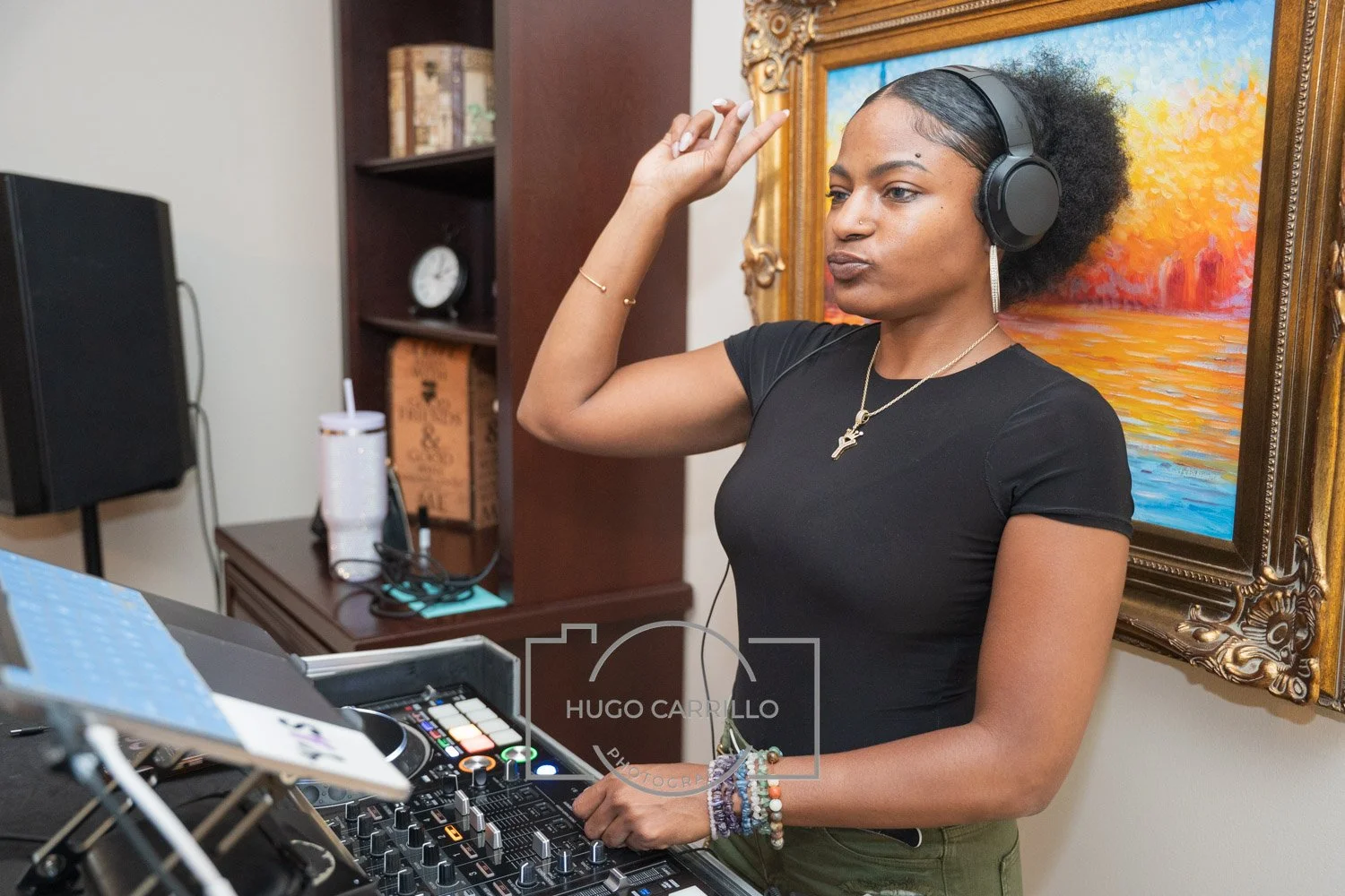A woman DJ wearing headphones, black t-shirt, and multiple bracelets, standing at a DJ console, adjusting equipment with her right hand, in a room with a colorful framed painting and a bookshelf.