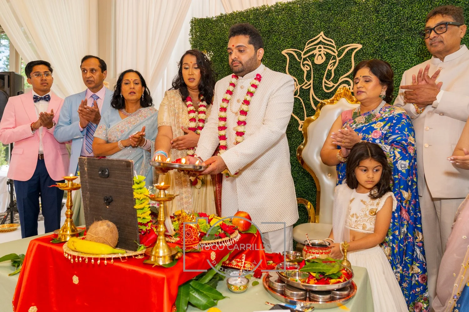 Hindu family participating in a religious ceremony with jewelry, offerings, and traditional decorations.