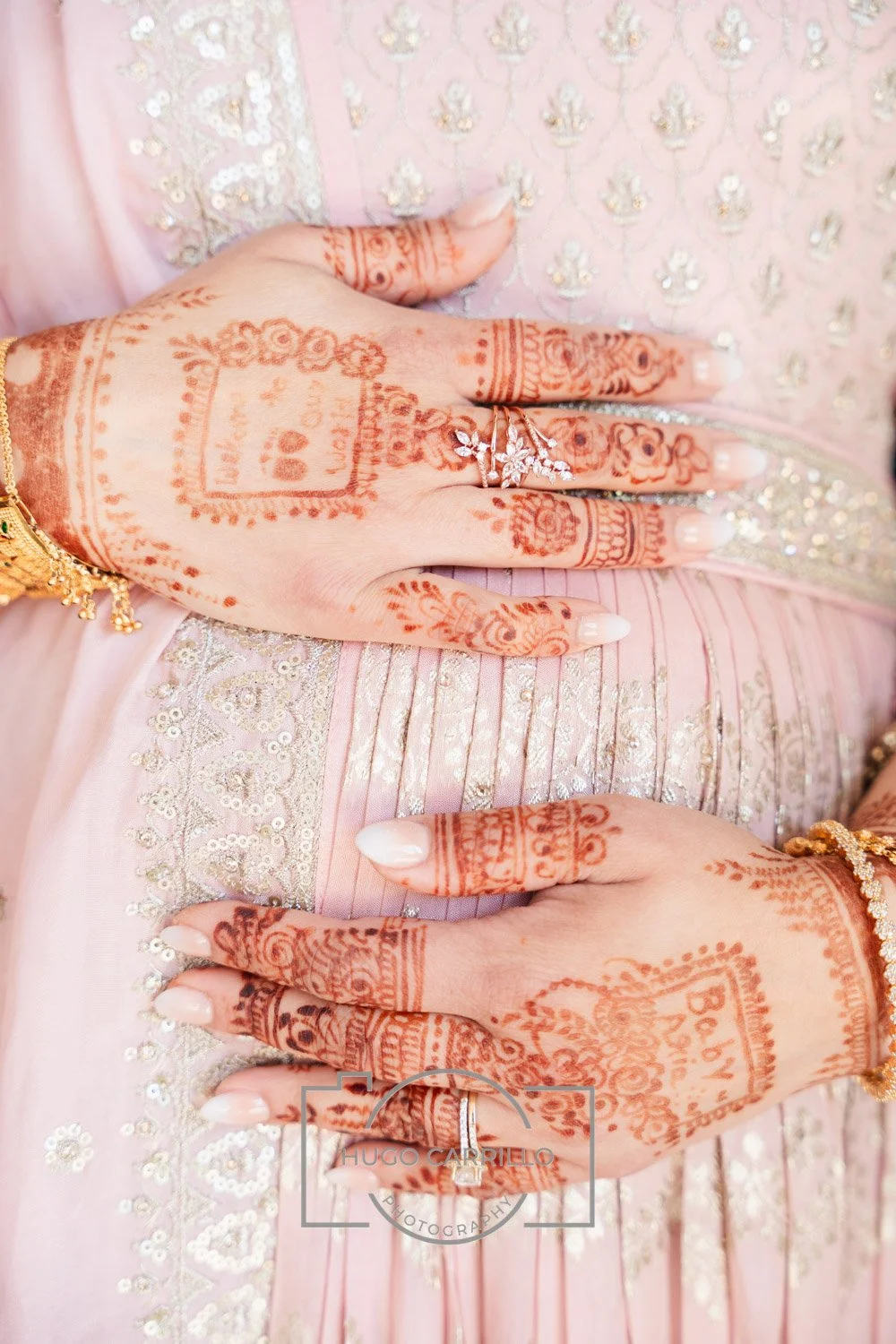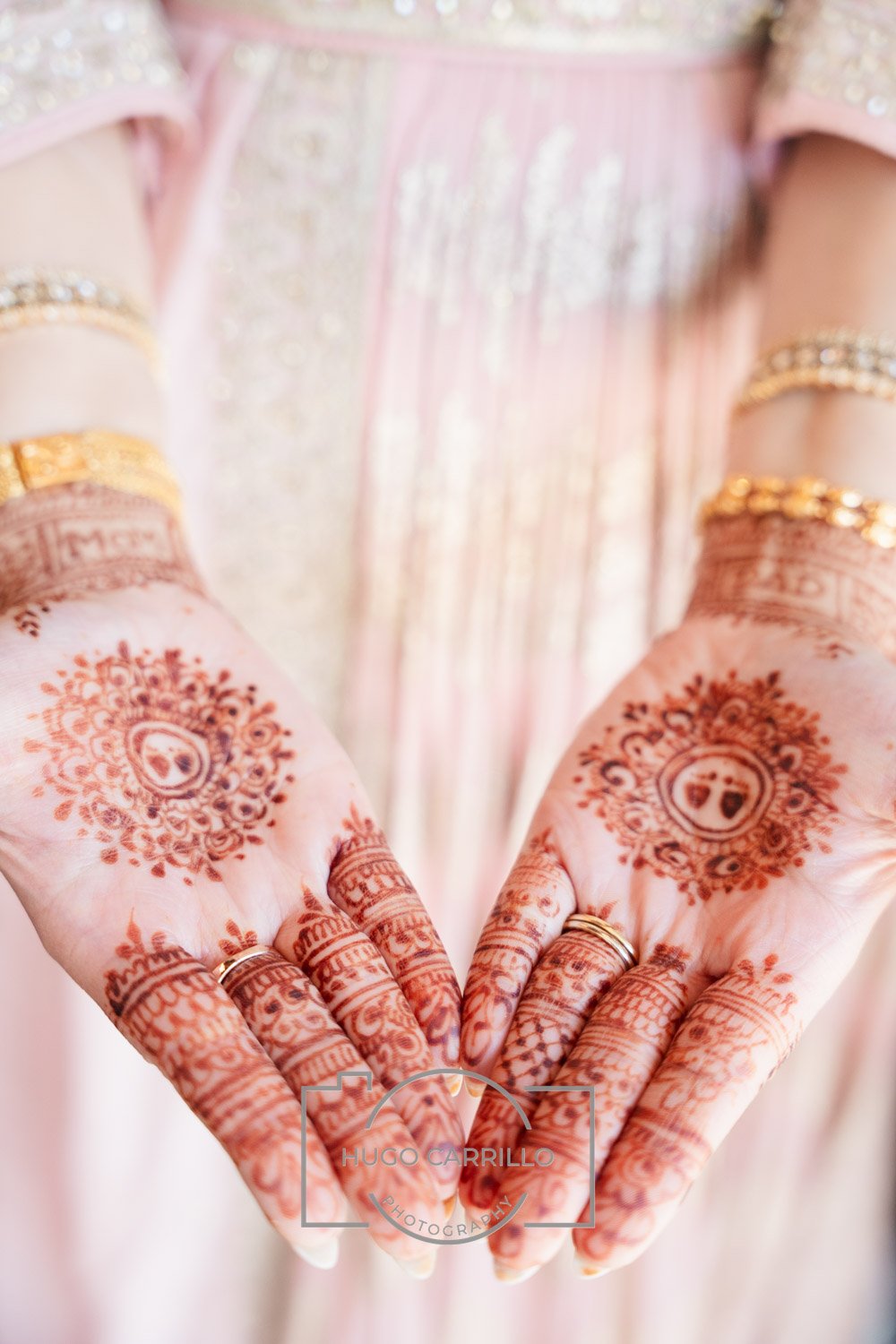Close-up of hands with intricate henna designs, adorned with rings and bracelets, held together against a soft pink and gold traditional attire.