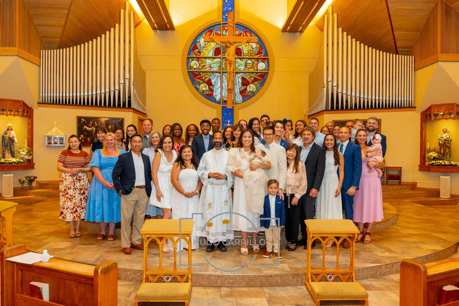 A woman holding a baby in a church during a baptism ceremony as a priest performs the ritual with gathered family members and friends watching.